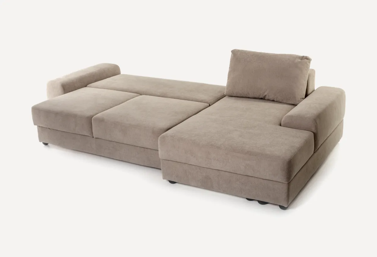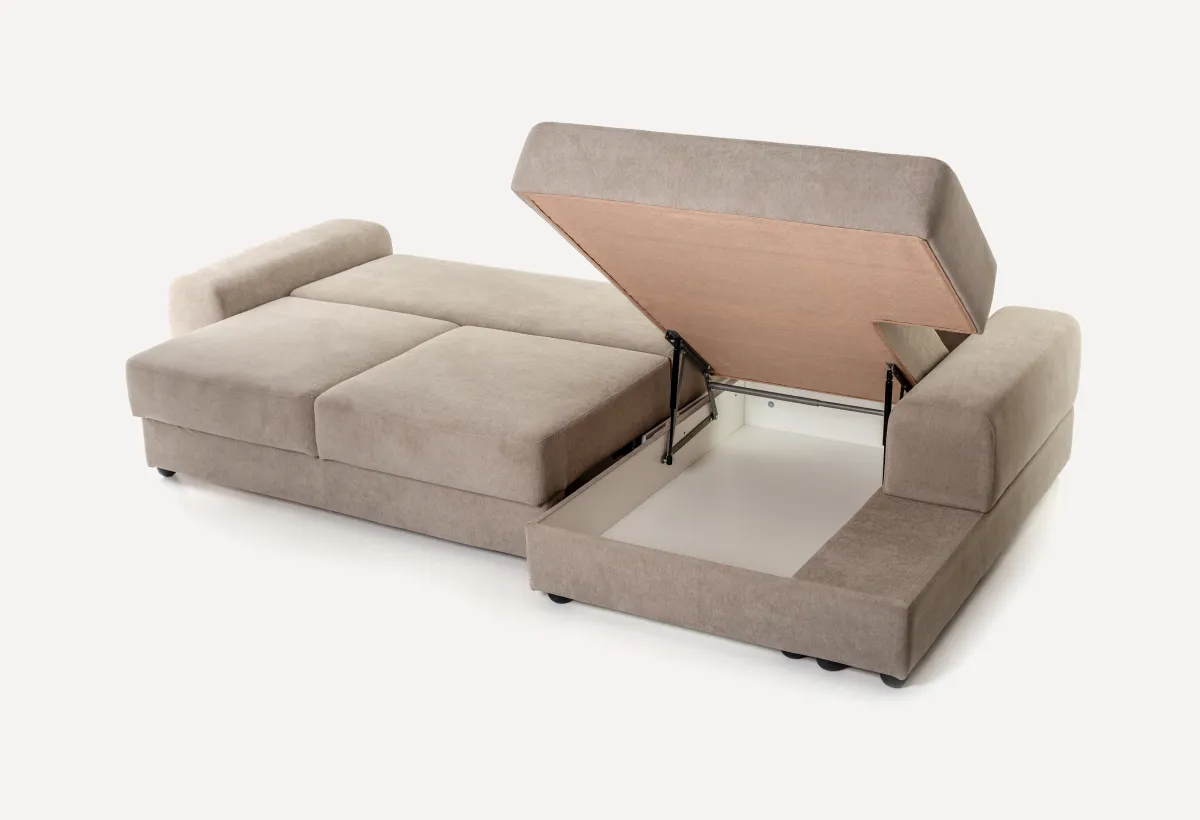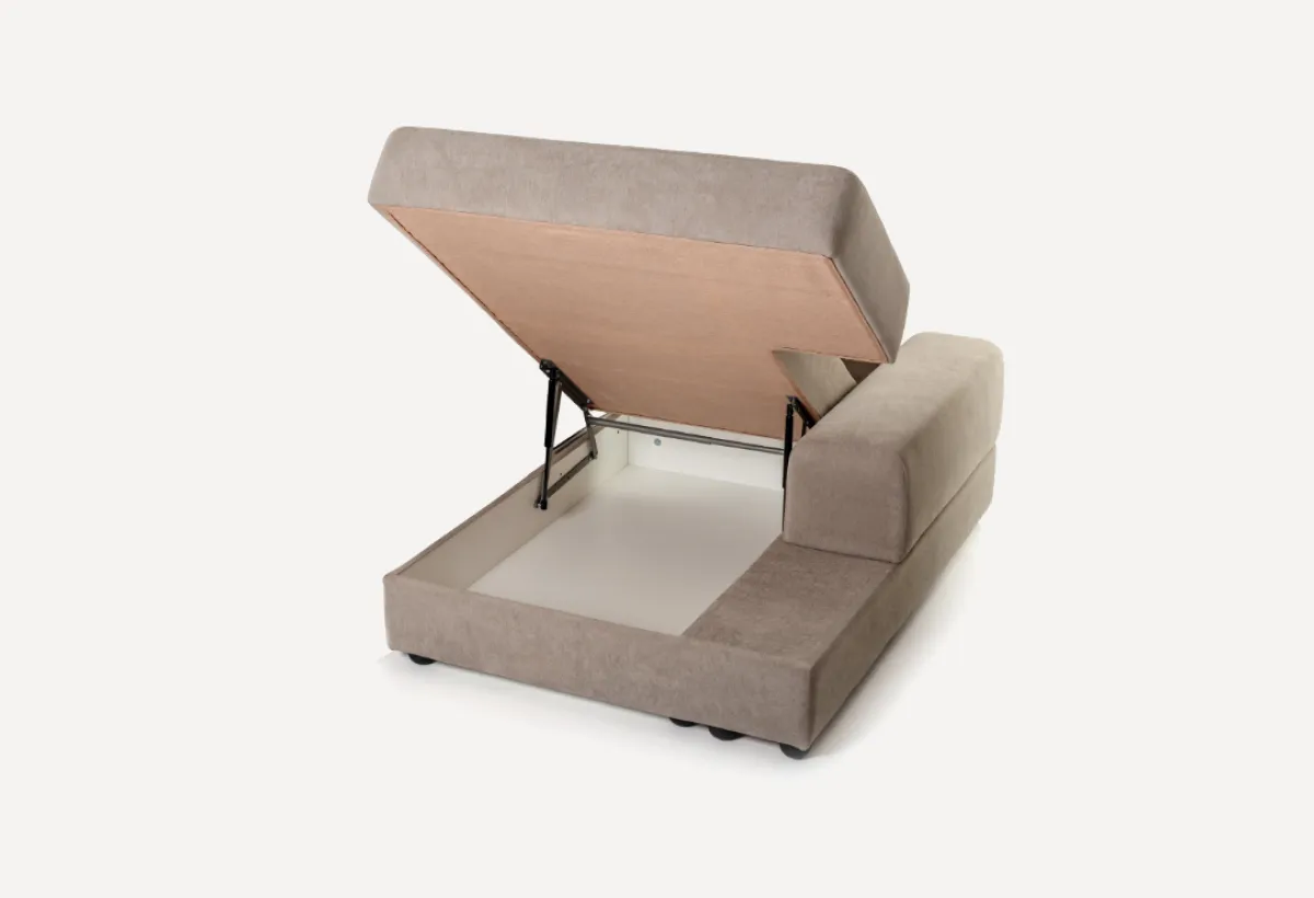 Оттоманка (левая / правая)Это такой квадратный модуль без спинки. Тоже есть подъемный механизм и короб для белья. Ставится обычно с краю, чтобы делать диван Г-образным или П-образным. На ней удобно лежать или сидеть, подложив подушку. Кстати, ящик внутри — полноценный.